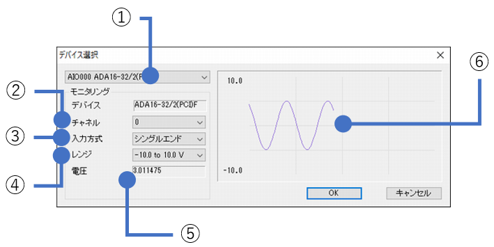 ※1:⑤電圧表示や⑥グラフ表示用の一時的な設定です。「データ収集条件の設定」へ反映されません。