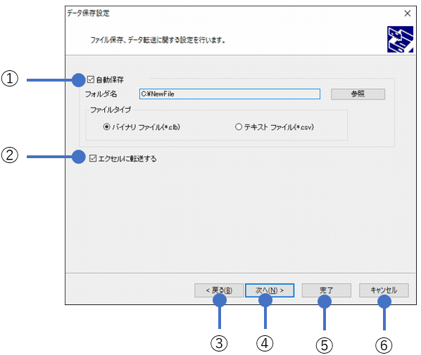 データ保存ページでは、収集データの自動保存に関する設定やEXCELへの転送設定を行います。