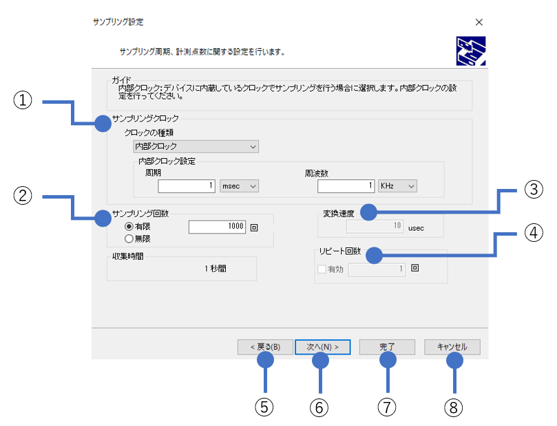 サンプリング設定ページでは、サンプリング回数とサンプリングクロックを設定します。