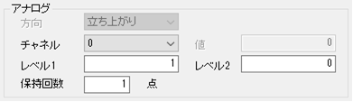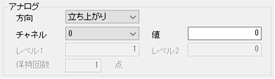 指定チャネルに入力されるアナログ信号の値が条件成立することによって、収集を停止します。 停止トリガとして使用するチャネルを選択し、トリガ条件成立となるレベルと信号の方向を設定します。 |