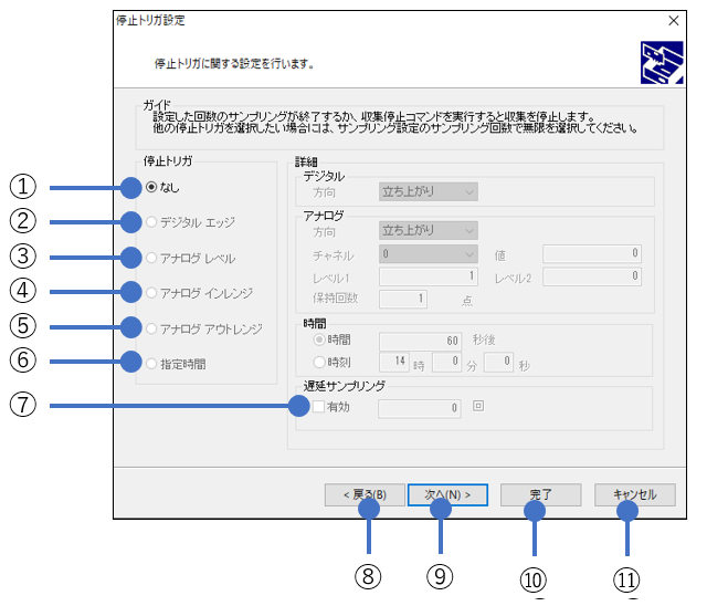 停止トリガ設定ページでは、データ収集の停止条件を設定します。