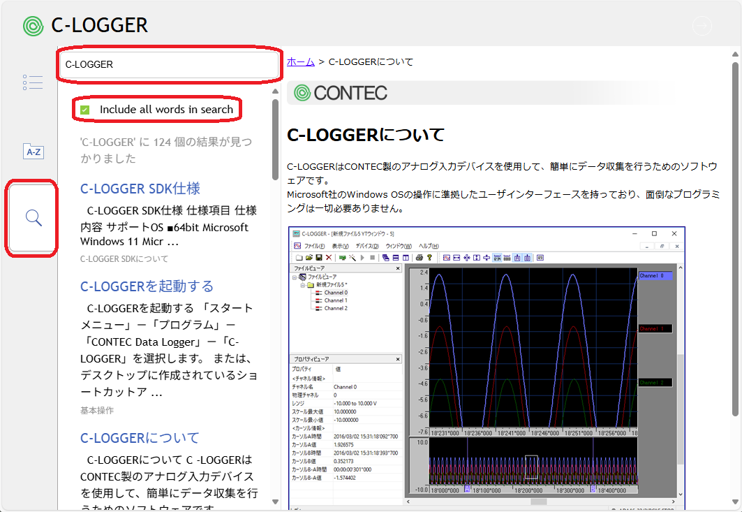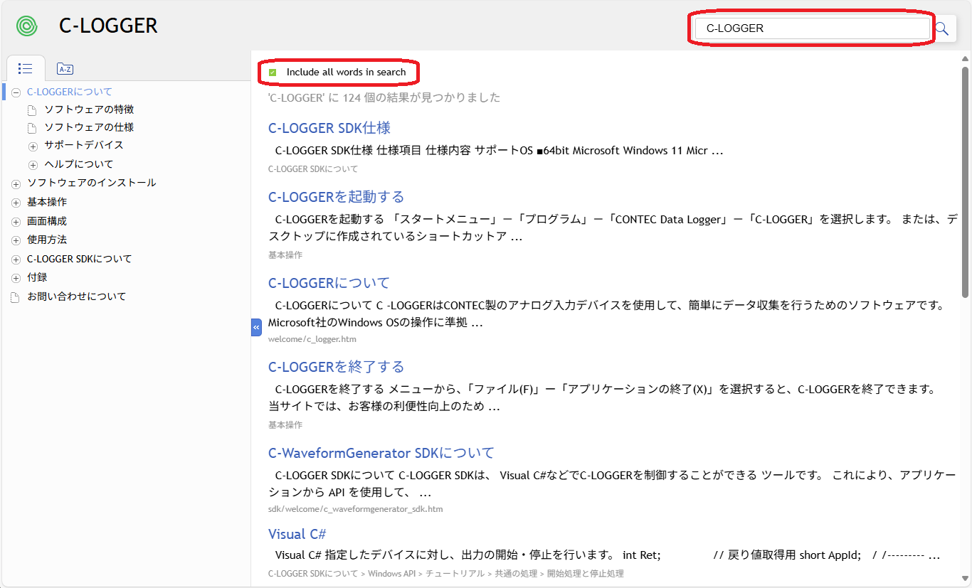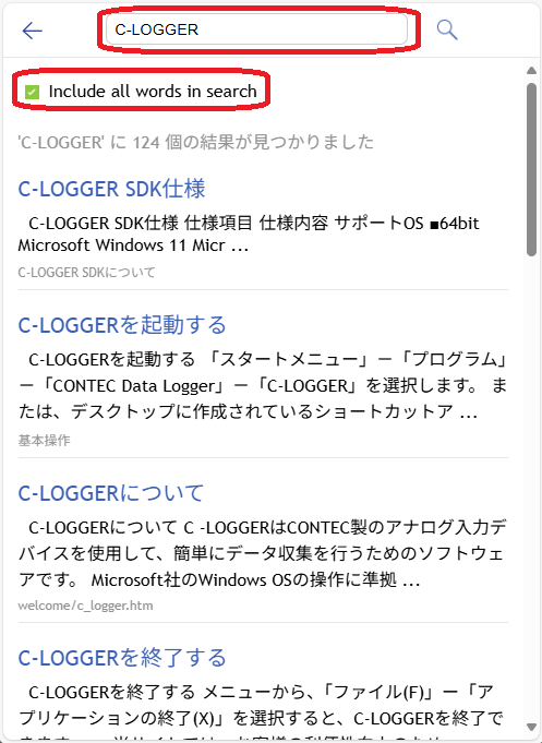 検索エリアで単語やフレーズを指定して、検索アイコン()をクリックすると、ヘルプファイル内の全文検索が行われ、対象となるトピックがリスト表示されます。