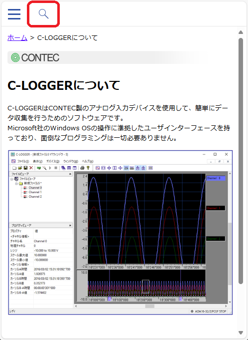 モバイル レイアウトで 検索エリアが表示されていない場合は、メニュー アイコンをクリックすると、検索エリアが表示され、全文検索することができます。