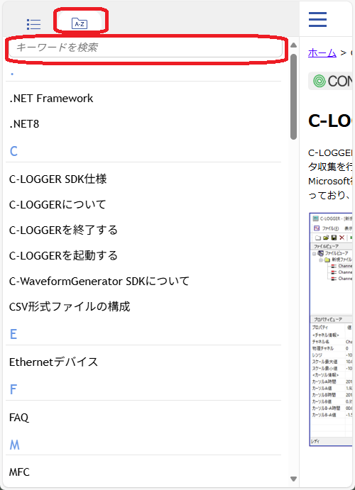 モバイル レイアウトで ナビゲーション エリアが表示されていない場合は、メニュー アイコンをクリックすると、ナビゲーションエリアが表示され索引タブを選択することができます。